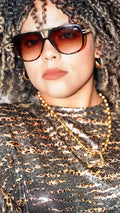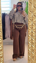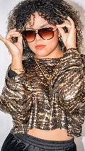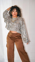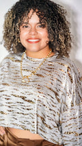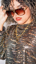 Blusa oversize fit manga larga con estampado metálico de leopardo. Corte ancho, manga ancha. Cuello alto. No tiene ninguna abertura. Tamaño corre al