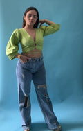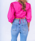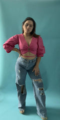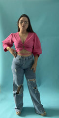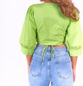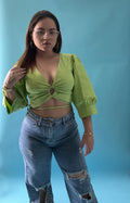 Crop top con manga 3/4 puff, tiene escote en V. Cierre con cordón. Se ajusta a todas las tallas