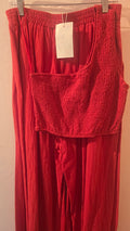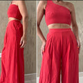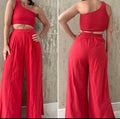 Conjunto pantalón largo con pinzas. Tiene bolsillos. Cierre con cremallera. Crop Top de una manga, completamente elástico. Tamaño corre al