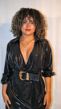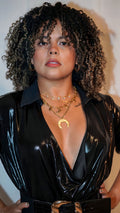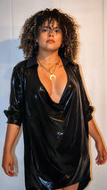 Blusón largo metálico con manga 3/4. Holgado y abierto en el pecho. Corre al size