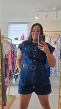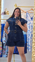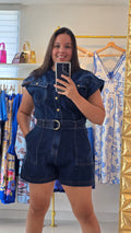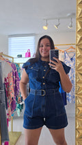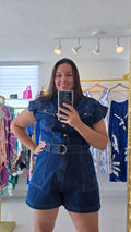 Romper denim con cuello redondo, manga corta, cierre con botones. Cinturón de la misma tela y bolsillos. Corre justo al size. Es denim rigido, de cintura ajusta y no estira. Si estas entre dos size, te recomiendo el size más grande.