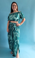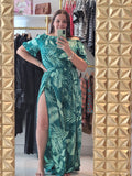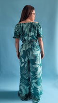 Pantalón con print de hojas. Cintura elastica con tira de ajuste Las patas tienen apertura (se abren al caminar). Boilas de aplique decorativas