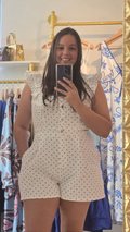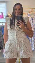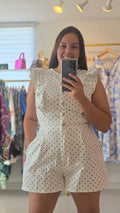 Romper estampado de lunares. Manga con volantes, cierre de botones y zipper. Tiene bolsillos. Ajusta en la cintura. Corre justo al size.