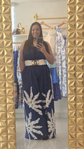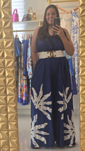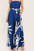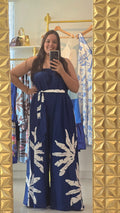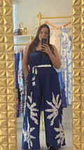 Jumpsuit en estampado sin mangas de pata ancha. Trae cinturón de la misma tela. Corre a su size. Si no quieres que te quede tan ancho puedes bajarle un size.