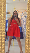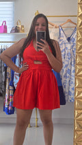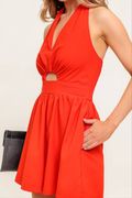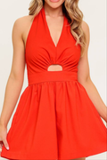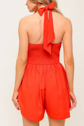 Romper con escote y amarre halter. Corte delantero y fruncido en la espalda. Tiene bolsillos. Corre al size
