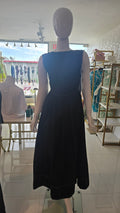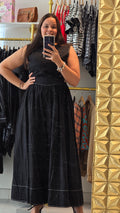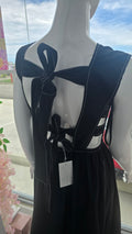 Traje negro largo, lado y espalda descubierta con lazos para amarre. Tiene elástico en la cintura. Corre al size