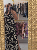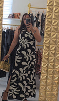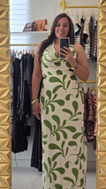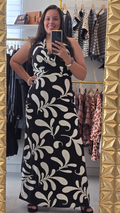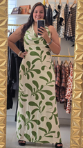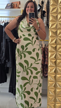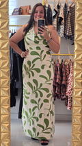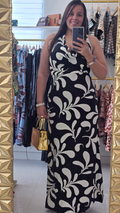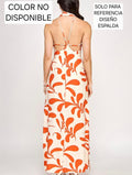 Traje largo en estampado. Es halter con una caída alfrente, tiene tiras decorativas y cierre con zipper en la espalda . No transparenta, tiene tiene forro y abertura en ambos lados hasta un poco más arriba de la rodilla.